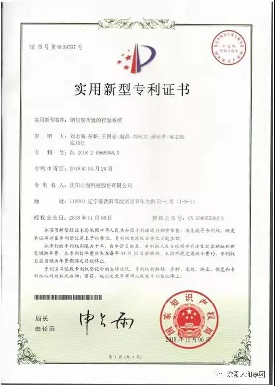 我公司自主研發(fā)的“鋼包吹氬的控制系統(tǒng)”和“一種具有剛性防護(hù)罩的吹氬裝置”兩項(xiàng)技術(shù),喜獲國(guó)家知識(shí)產(chǎn)權(quán)局頒發(fā)的專利證書。